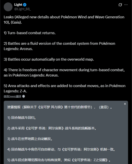 推主Light透露,《风/浪》将采用“流动式回合制”战斗系统,在保留《宝可梦传说:阿尔宙斯》半即时战斗精髓的基础上进行体系化升级。尽管刚公布的《宝可梦传说 Z-A》借鉴了《异度神剑》的简化战斗模式,但主线作品仍将坚守回合制传统并注入新元素。据悉前作的“范围攻击”与“即时攻击机制”将经过改良后融入新作回合制框架。